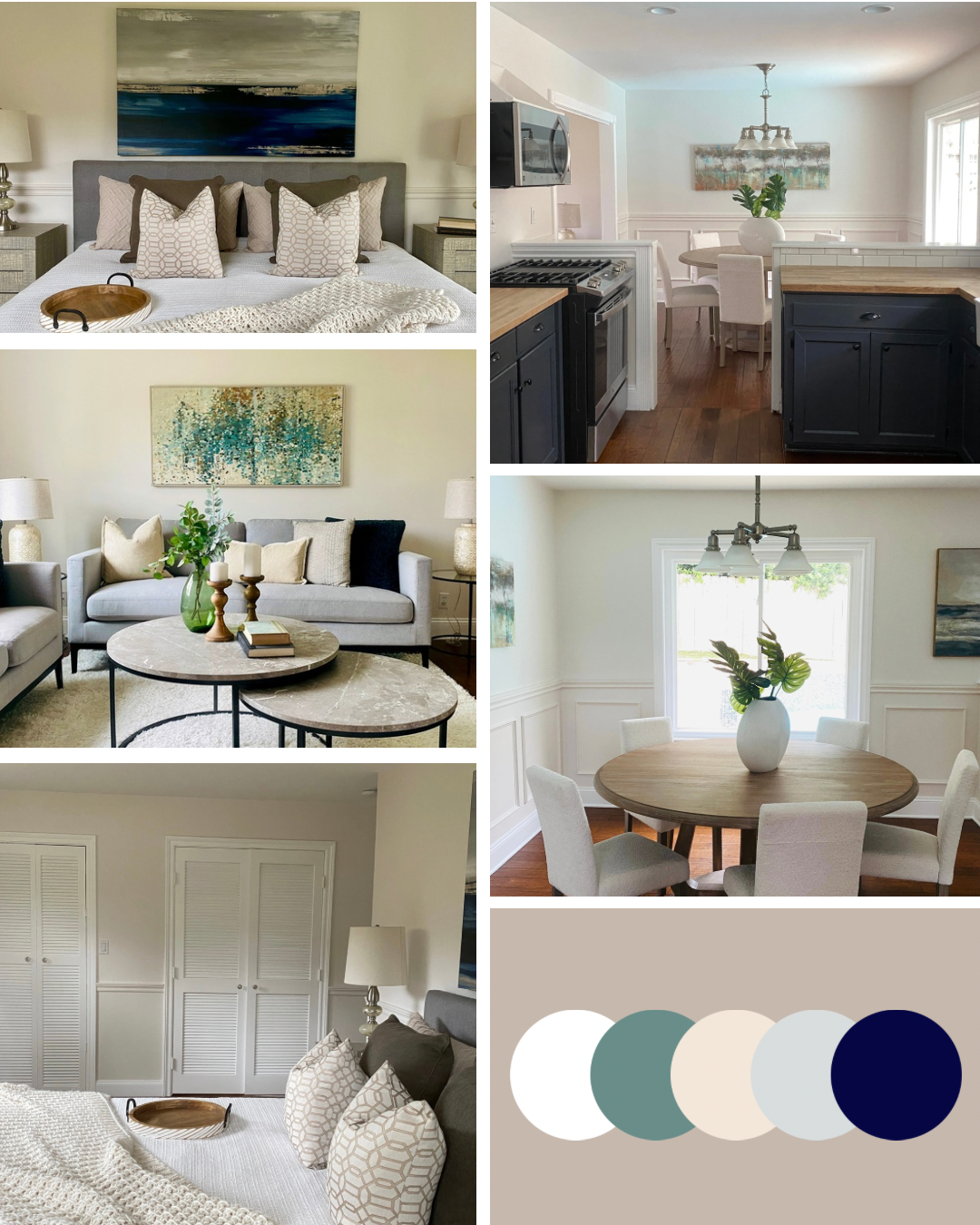 This palette is all about balance: crisp white and taupe form a soft base, while deep navy and sage green add richness and depth. It’s a favorite for homes that lean more modern or architectural. This particular home was a beautiful colonial style home but it also lied very close to the shores of Encinitas. It needed a sophisticated coastal vibe that could bring the two styles together.