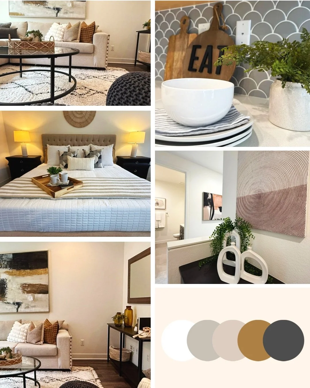 This palette is all about coziness and quiet sophistication—soft whites, greige tones, caramel accents, and hints of charcoal & black.